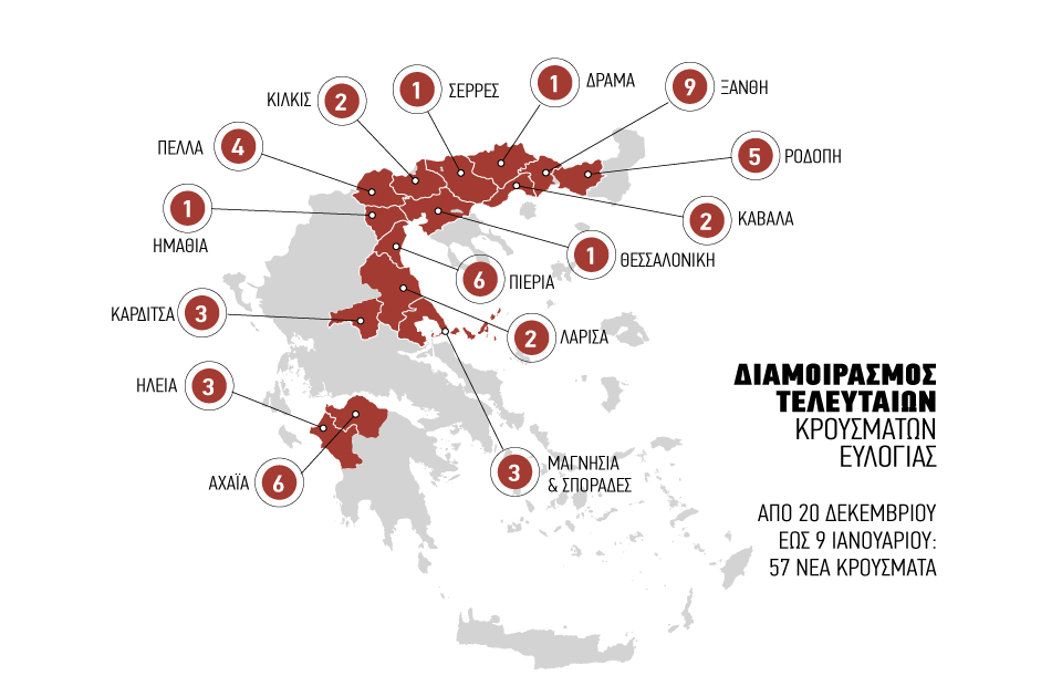 Για την περίοδο αναφοράς 20 Δεκεμβρίου 2025 – 9 Ιανουαρίου 2026 καταγράφηκαν 57 νέα κρούσματα σε 16 περιοχές, βάσει των αποτελεσμάτων των εργαστηριακών ελέγχων.